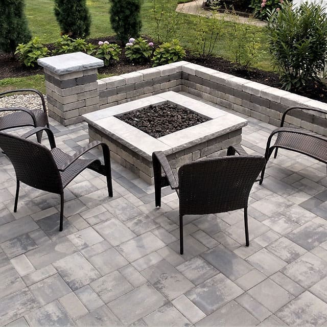 Verona Fire Pit shown in Granite City Blend with Bluestone coping